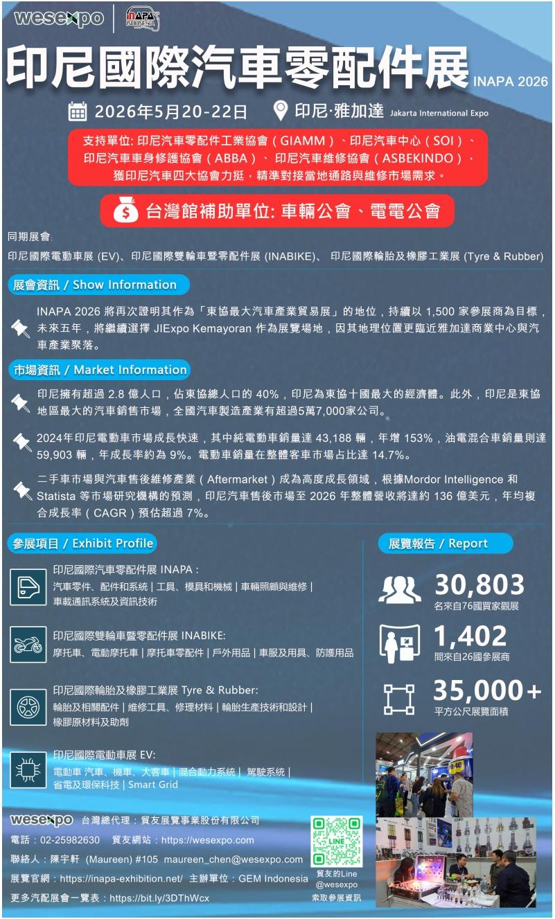 [車輛+電電公會補助並籌組台灣館] INAPA 2026 印尼國際汽車零配件展暨論壇 / EV & Charging Indonesia 印尼國際電動車展